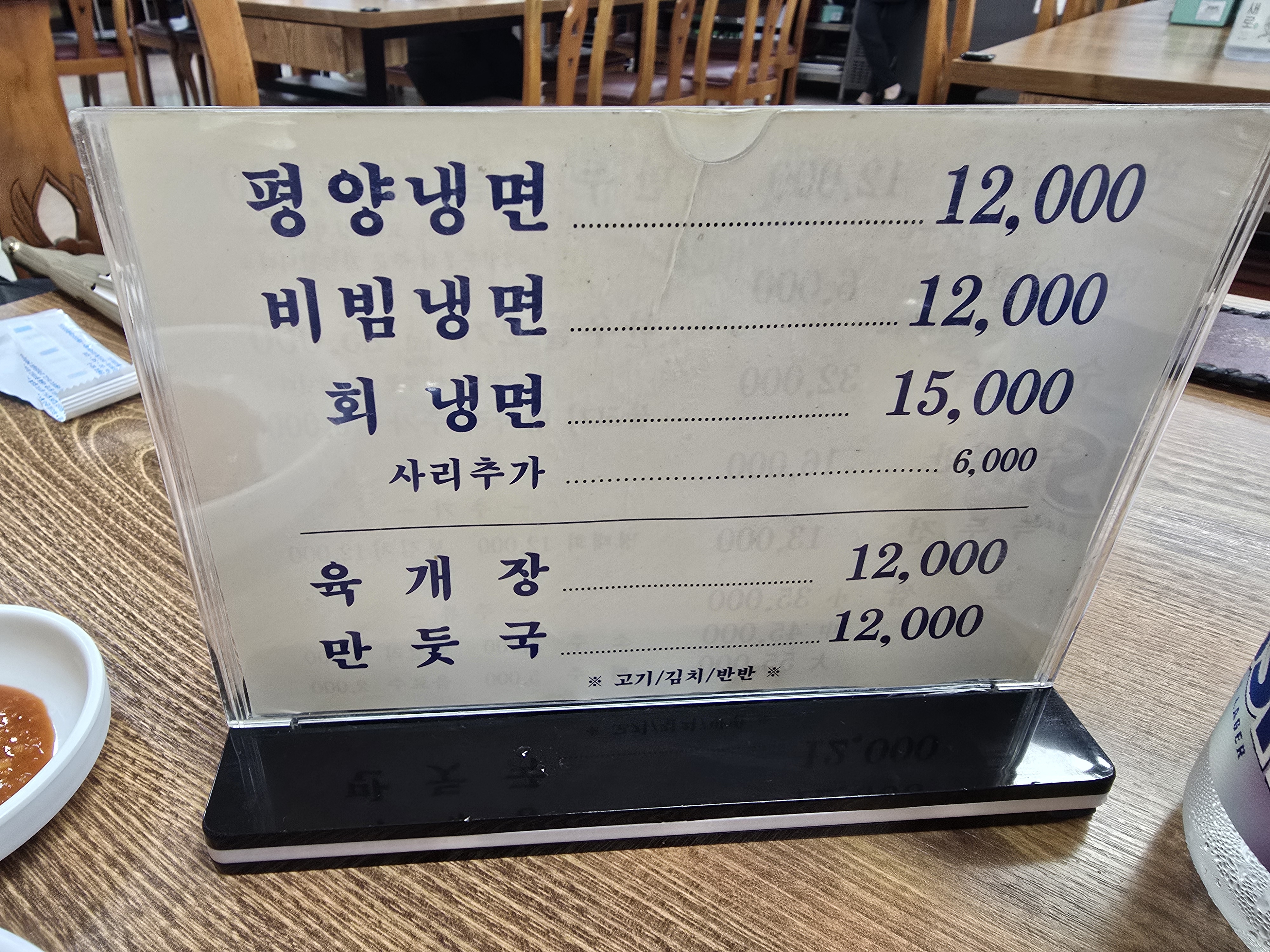 냉면은 평양냉면, 비빔냉면, 회 냉면 이렇게 3가지가 끝이고 나머지는 사이드와 다른 식사류가 있었습니다.