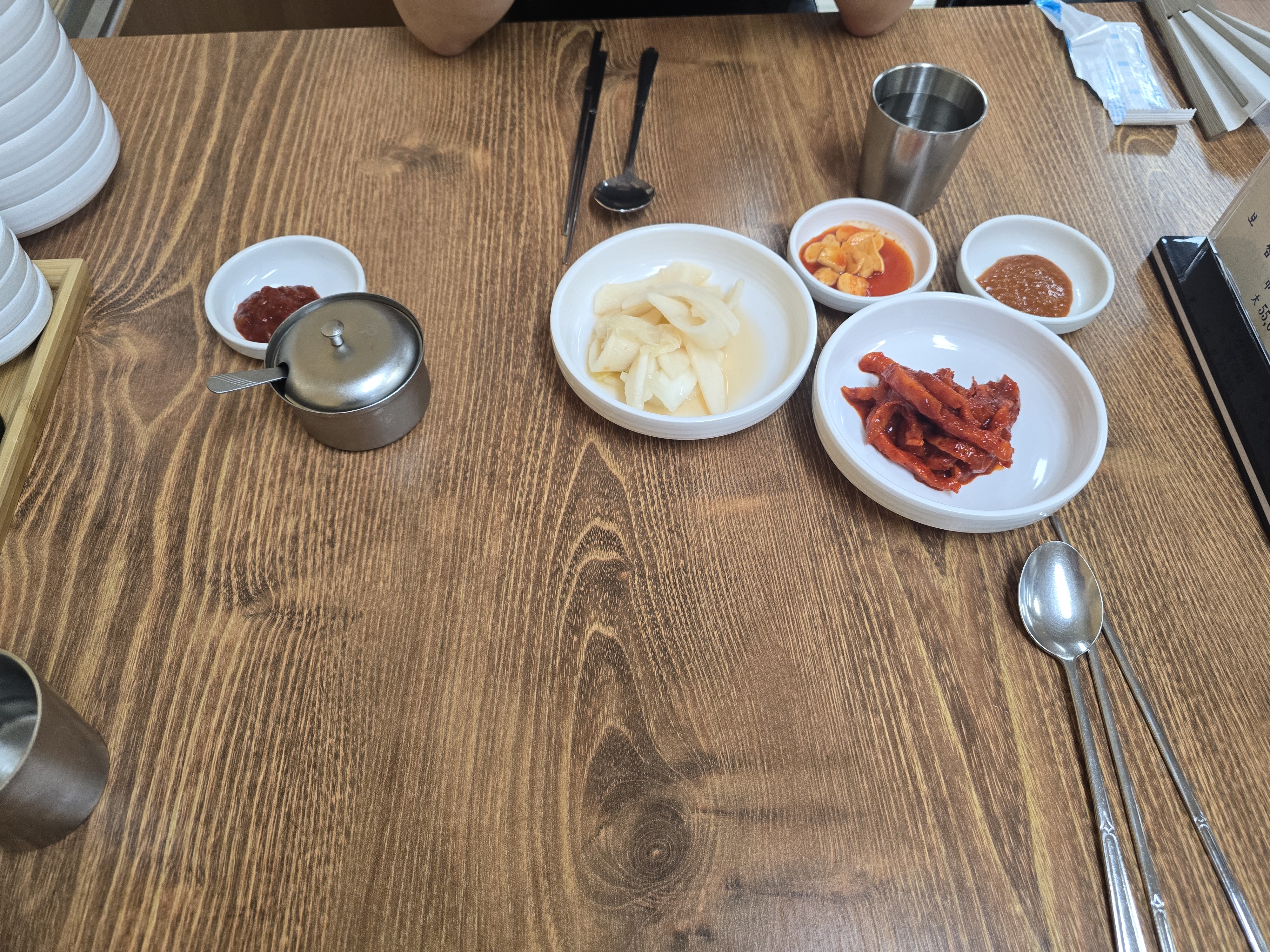각종 소스류들과 앞접시 휴지등이 비치되어 있고 기본 반찬이 냉면집이라 많지는 않습니다.